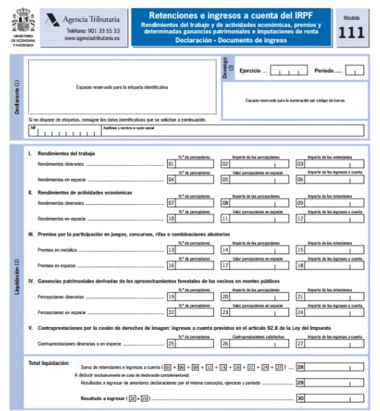 El modelo 111, es un modelo trimestral, en el que las entidades sin ánimo de lucro detallan las retenciones realizadas a cuenta del IRPF de los trabajadores que tienen contratados, profesionales que hayan realizado algún servicio, formadores y/o los ponentes, durante el último trimestre.